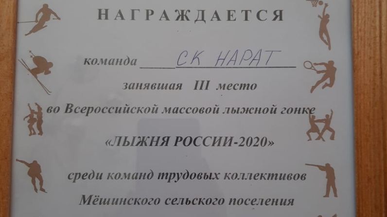 На ежегодных Всероссийской массовой лыжной гонке "ЛЫЖНЯ РОССИИ - 2020" среди команд трудовых коллективов Мешинского сельского поселения, команда МАУ "СК "Нарат" заняла 3 место и награждена дипломам и денежными призами.
